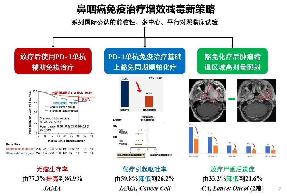中山大学肿瘤防治中心孙颖、马骏团队通过一系列国际公认的前瞻性、多中心、平行对照临床试验,在鼻咽癌增效方面,证实放疗后使用PD-1单抗辅助免疫治疗,可将失败风险降低了44%,生存率由77.3%提高到86.9%;在减毒方面,研制出在PD-1单抗免疫治疗基础上豁免同期顺铂化疗,不降低疗效的同时,将化疗引起呕吐率由59.8%降低到26.2%;并制定了“豁免化疗后肿瘤缩退区域高剂量照射”,使放疗严重后遗症由33.2%降低到21.6%。由此,创立了鼻咽癌免疫治疗“增效减毒”新策略。