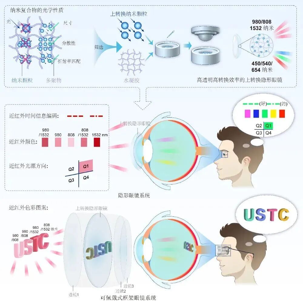 中国科学技术大学薛天、马玉乾团队与中国科学技术大学龚兴龙团队和复旦大学张凡团队合作,创新性地将可转换红外光至可见光的纳米材料与隐形眼镜聚合物结合,研制出高透明度、高转换效率的上转换隐形眼镜。该隐形眼镜无需电源与复杂设备,实现了人类对近红外光的时间、空间与色彩(光谱)多维度信息的裸眼感知,并模拟人体三色视觉机制,实现多红外光谱转换为三原色可见光的近红外色彩视觉。该技术突破人类视觉固有可见光谱段的极限,拓展人类视觉边界,为类脑感知和可穿戴视觉材料提供技术新范式。未来将在夜视、色盲治疗、信息加密及物性红外波谱裸眼探测等方向具有广阔开发前景,为构筑类脑多光谱智能感知体系提供重要支撑。哈佛大学Michael H. Do在Cell Biomaterials杂志上撰文评价:“巧妙地绕过了自然界对人体视觉功能的限制”,Nature报道该成果“为理解我们周围的世界提供了新的可能性”。