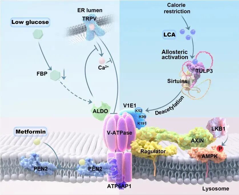 1.卡路里限制(CR)升高的石胆酸与TULP3结合尚融,激活sirtuins,进而去乙酰化溶酶体膜里的质子泵v-ATPase的V1E1亚基(作用于K52、K99和K191残基),由此抑制了v-ATPase。该过程促使AXIN/LKB1转位至溶酶体表面,由LKB1这一上游的激酶磷酸化并激活AMPK(右轴)。